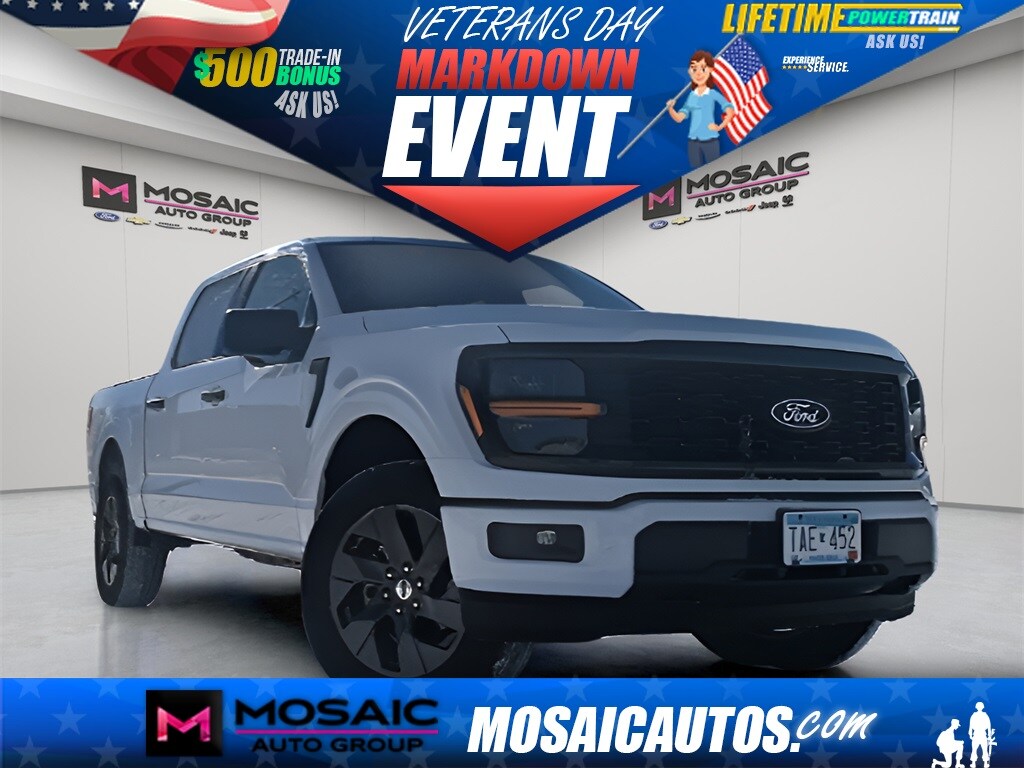 2025 Ford F-150 STX Oxford White F-150 STX, 4D SuperCrew, 2.7L V6 EcoBoost, 10-Speed Automatic, 4WD, Oxford White, Black Cloth, Equipment Group 200A Mid, GVWR: 6,650 lbs Payload Package, LED Fog Lamps w/LED Cornering Lamp, Wheels: 20" Dark Gray w/Machined Aluminum. STX Price includes: $1000 - Mega Bonus Cash. Exp. 12/17/2025 $1250 - Retail Bonus Cash. Exp. 01/05/2026