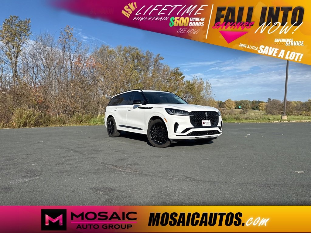 2025 Lincoln 4D Sport Utility Aviator Reserve White Aviator Reserve AWD JET PACKAGE, 4D Sport Utility, 3.0L V6, 10-Speed Automatic, AWD, White, Onyx Leather, Adaptive suspension, Heads-Up Display, Lincoln BlueCruise Equipped (4-Years Included), Lincoln Digital Experience, Navigation system: Connected Navigation (1-year trial), Radio: Revel Audio System w/14 Speakers, SiriusXM, Wheels: 22" Black Aluminum w/Adaptive Suspension. 3.0L V6 10-Speed Automatic AWD